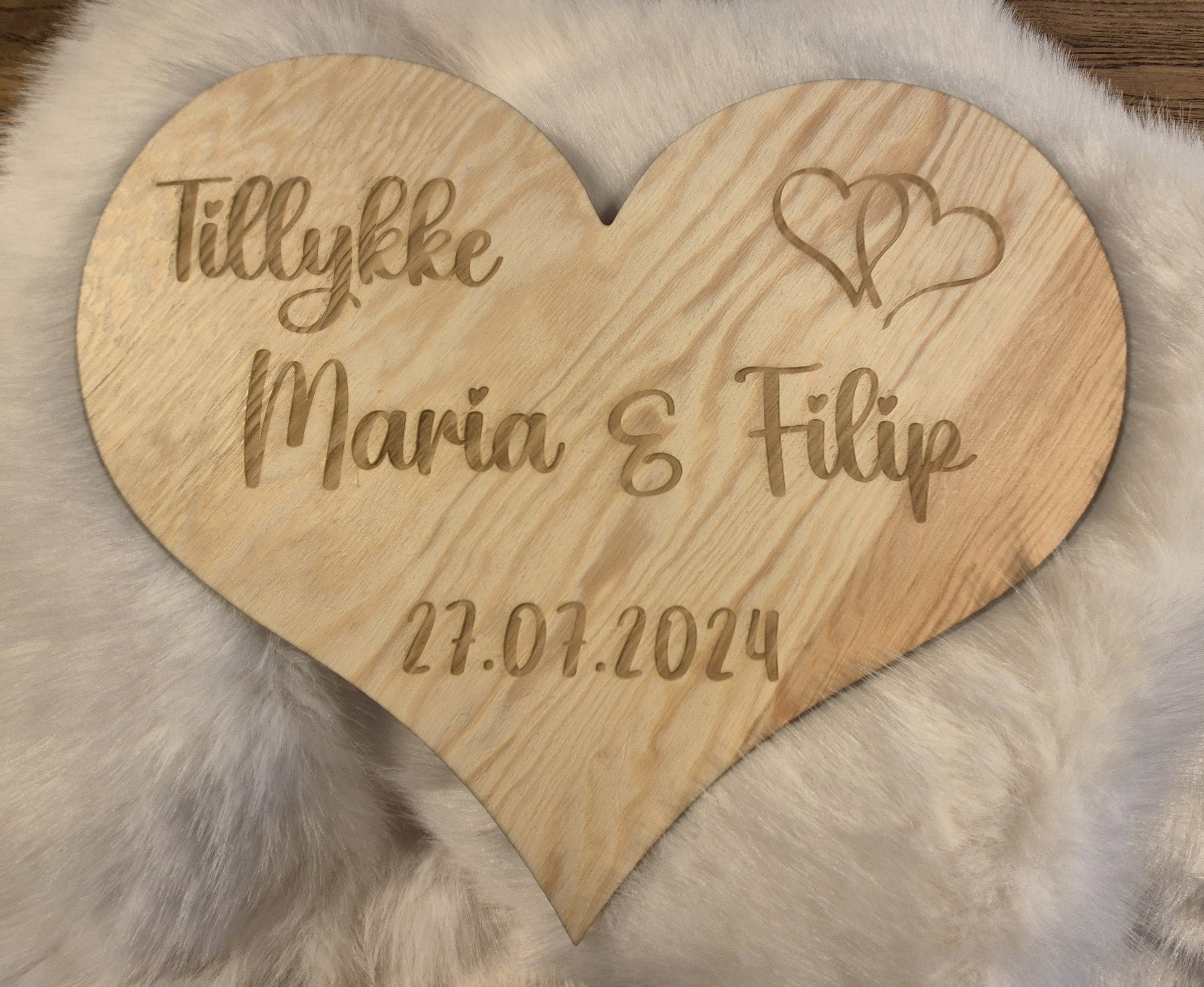 Teksten er graveret i træet og hvis parrets navne er lange vil vi tilpasse det, så det passer flot i hjertet.