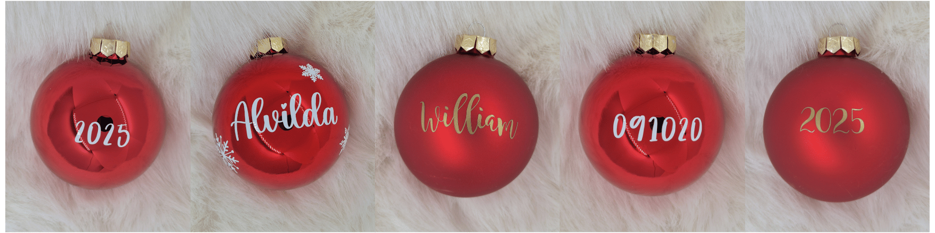 Personliggør vores 8 cm julekugler med navn, årstal og snefnug ❄️